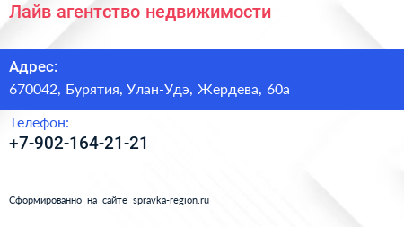 Лайв, агентство недвижимости по адресу 670042, Бурятия, Улан-Удэ, Жердева, 60а в дальнейшем Организация, размещена в следующих категориях: