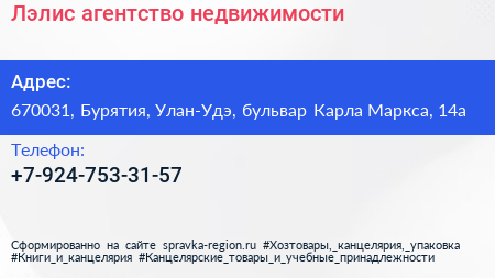 Лэлис, агентство недвижимости по адресу 670031, Бурятия, Улан-Удэ, бульвар Карла Маркса, 14а в дальнейшем Организация, размещена в следующих категориях: