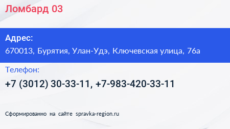 Ломбард 03 по адресу 670013, Бурятия, Улан-Удэ, Ключевская улица, 76а в дальнейшем Организация, размещена в следующих категориях: