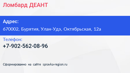 Ломбард-ДЕАНТ по адресу 670002, Бурятия, Улан-Удэ, Октябрьская, 12а в дальнейшем Организация, размещена в следующих категориях: