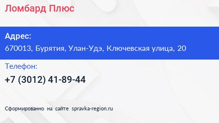 Ломбард Плюс по адресу 670013, Бурятия, Улан-Удэ, Ключевская улица, 20 в дальнейшем Организация, размещена в следующих категориях:
