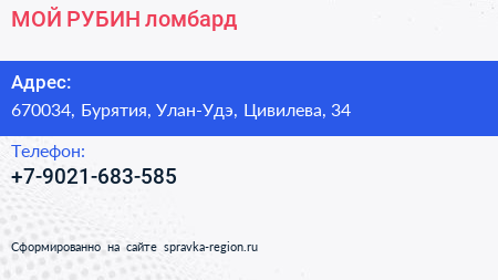 МОЙ РУБИН, ломбард по адресу 670034, Бурятия, Улан-Удэ, Цивилева, 34 в дальнейшем Организация, размещена в следующих категориях: