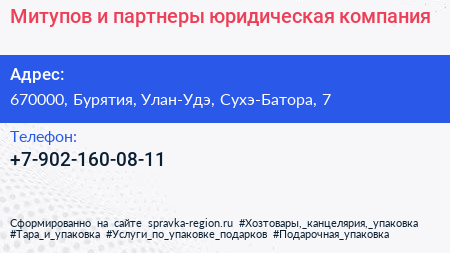 Митупов и партнеры, юридическая компания по адресу 670000, Бурятия, Улан-Удэ, Сухэ-Батора, 7 в дальнейшем Организация, размещена в следующих категориях: