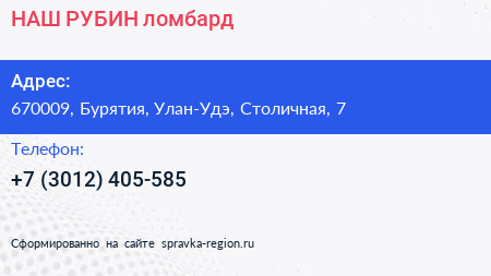 НАШ РУБИН, ломбард по адресу 670009, Бурятия, Улан-Удэ, Столичная, 7 в дальнейшем Организация, размещена в следующих категориях: