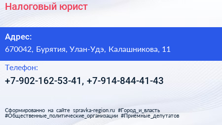 Налоговый юрист по адресу 670042, Бурятия, Улан-Удэ, Калашникова, 11 в дальнейшем Организация, размещена в следующих категориях: