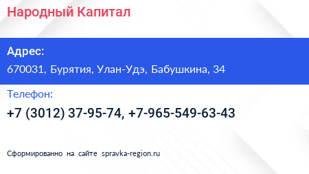 Народный Капитал по адресу 670031, Бурятия, Улан-Удэ, Бабушкина, 34 в дальнейшем Организация, размещена в следующих категориях: