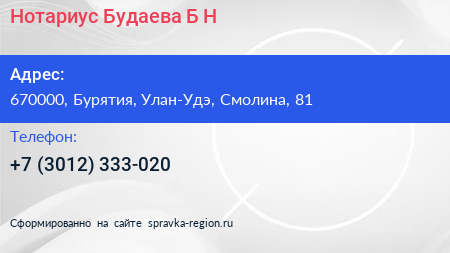 Нотариус Будаева Б.Н. по адресу 670000, Бурятия, Улан-Удэ, Смолина, 81 в дальнейшем Организация, размещена в следующих категориях: