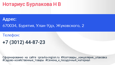 Нотариус Бурлакова Н.В. по адресу 670034, Бурятия, Улан-Удэ, Жуковского, 2 в дальнейшем Организация, размещена в следующих категориях: