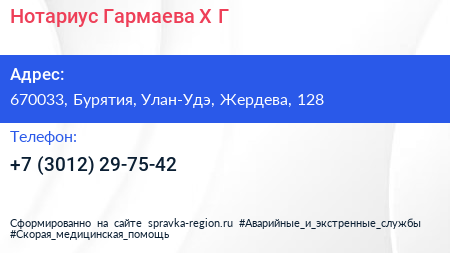 Нотариус Гармаева Х.Г. по адресу 670033, Бурятия, Улан-Удэ, Жердева, 128 в дальнейшем Организация, размещена в следующих категориях: