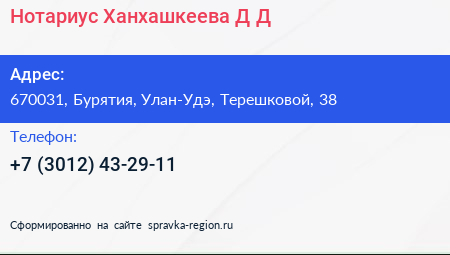 Нотариус Ханхашкеева Д.Д. по адресу 670031, Бурятия, Улан-Удэ, Терешковой, 38 в дальнейшем Организация, размещена в следующих категориях: