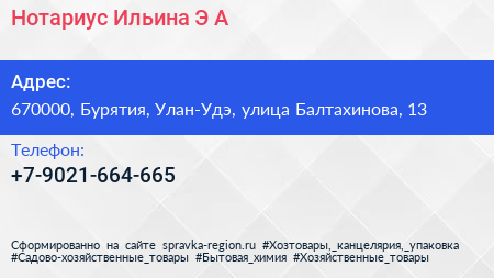 Нотариус Ильина Э.А. по адресу 670000, Бурятия, Улан-Удэ, улица Балтахинова, 13 в дальнейшем Организация, размещена в следующих категориях: