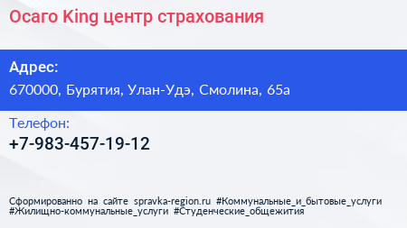 Осаго King, центр страхования по адресу 670000, Бурятия, Улан-Удэ, Смолина, 65а в дальнейшем Организация, размещена в следующих категориях: