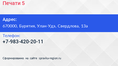 Печати 5 по адресу 670000, Бурятия, Улан-Удэ, Свердлова, 13а в дальнейшем Организация, размещена в следующих категориях: