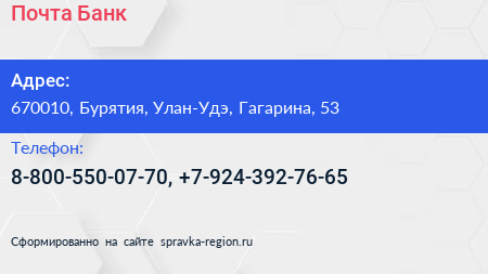 Почта Банк по адресу 670010, Бурятия, Улан-Удэ, Гагарина, 53 в дальнейшем Организация, размещена в следующих категориях: