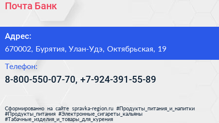 Почта Банк по адресу 670002, Бурятия, Улан-Удэ, Октябрьская, 19 в дальнейшем Организация, размещена в следующих категориях: