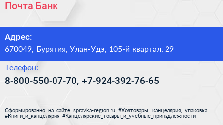 Почта Банк по адресу 670049, Бурятия, Улан-Удэ, 105-й квартал, 29 в дальнейшем Организация, размещена в следующих категориях: