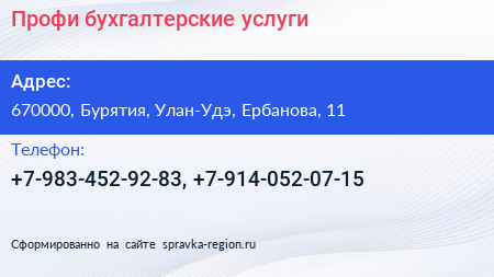 Профи, бухгалтерские услуги по адресу 670000, Бурятия, Улан-Удэ, Ербанова, 11 в дальнейшем Организация, размещена в следующих категориях: