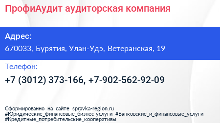 ПрофиАудит, аудиторская компания по адресу 670033, Бурятия, Улан-Удэ, Ветеранская, 19 в дальнейшем Организация, размещена в следующих категориях:
