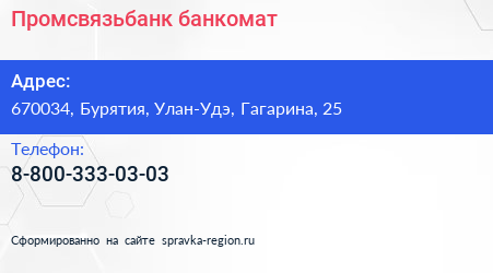 Промсвязьбанк, банкомат по адресу 670034, Бурятия, Улан-Удэ, Гагарина, 25 в дальнейшем Организация, размещена в следующих категориях:
