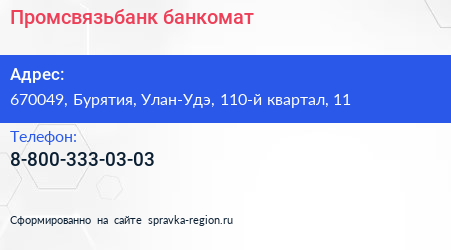 Промсвязьбанк, банкомат по адресу 670049, Бурятия, Улан-Удэ, 110-й квартал, 11 в дальнейшем Организация, размещена в следующих категориях: