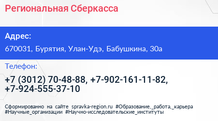 Региональная Сберкасса по адресу 670031, Бурятия, Улан-Удэ, Бабушкина, 30а в дальнейшем Организация, размещена в следующих категориях: