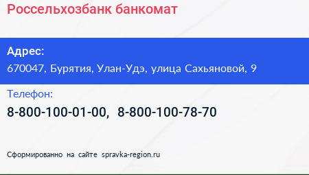 Россельхозбанк, банкомат по адресу 670047, Бурятия, Улан-Удэ, улица Сахьяновой, 9 в дальнейшем Организация, размещена в следующих категориях:
