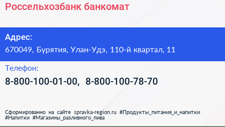 Россельхозбанк, банкомат по адресу 670049, Бурятия, Улан-Удэ, 110-й квартал, 11 в дальнейшем Организация, размещена в следующих категориях: