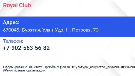 Royal Club по адресу 670045, Бурятия, Улан-Удэ, Н. Петрова, 70 в дальнейшем Организация, размещена в следующих категориях: