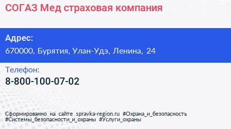 СОГАЗ-Мед, страховая компания по адресу 670000, Бурятия, Улан-Удэ, Ленина, 24 в дальнейшем Организация, размещена в следующих категориях: