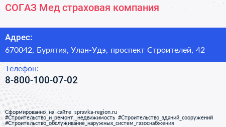 СОГАЗ-Мед, страховая компания по адресу 670042, Бурятия, Улан-Удэ, проспект Строителей, 42 в дальнейшем Организация, размещена в следующих категориях: