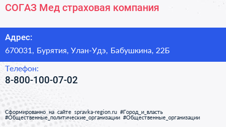 СОГАЗ-Мед, страховая компания по адресу 670031, Бурятия, Улан-Удэ, Бабушкина, 22Б в дальнейшем Организация, размещена в следующих категориях:
