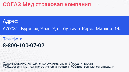 СОГАЗ-Мед, страховая компания по адресу 670031, Бурятия, Улан-Удэ, бульвар Карла Маркса, 14а в дальнейшем Организация, размещена в следующих категориях: