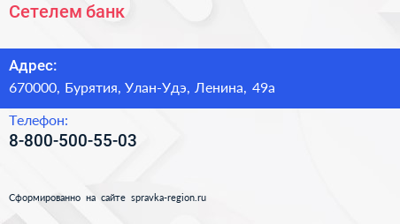 Сетелем банк по адресу 670000, Бурятия, Улан-Удэ, Ленина, 49а в дальнейшем Организация, размещена в следующих категориях: