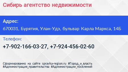Сибирь, агентство недвижимости по адресу 670031, Бурятия, Улан-Удэ, бульвар Карла Маркса, 14Б в дальнейшем Организация, размещена в следующих категориях: