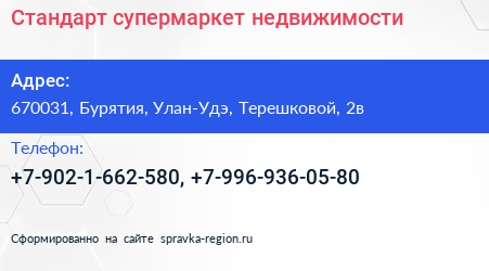 Стандарт, супермаркет недвижимости по адресу 670031, Бурятия, Улан-Удэ, Терешковой, 2в в дальнейшем Организация, размещена в следующих категориях: