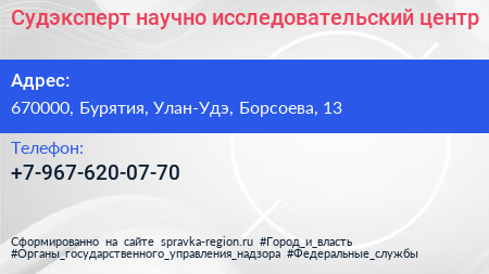 Судэксперт, научно-исследовательский центр по адресу 670000, Бурятия, Улан-Удэ, Борсоева, 13 в дальнейшем Организация, размещена в следующих категориях: