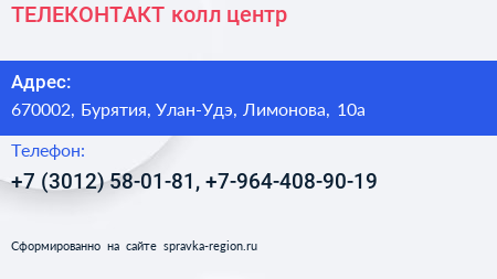 ТЕЛЕКОНТАКТ, колл-центр по адресу 670002, Бурятия, Улан-Удэ, Лимонова, 10а в дальнейшем Организация, размещена в следующих категориях: