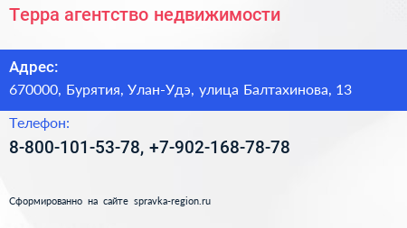 Терра, агентство недвижимости по адресу 670000, Бурятия, Улан-Удэ, улица Балтахинова, 13 в дальнейшем Организация, размещена в следующих категориях: