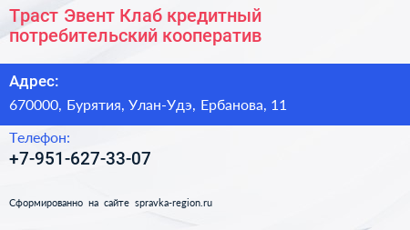 Траст Эвент Клаб, кредитный потребительский кооператив по адресу 670000, Бурятия, Улан-Удэ, Ербанова, 11 в дальнейшем Организация, размещена в следующих категориях: