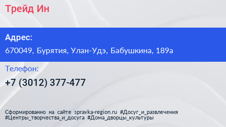 Трейд-Ин по адресу 670049, Бурятия, Улан-Удэ, Бабушкина, 189а в дальнейшем Организация, размещена в следующих категориях: