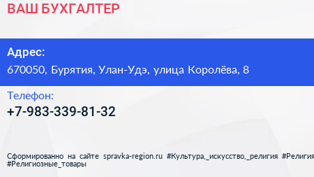 ВАШ БУХГАЛТЕР по адресу 670050, Бурятия, Улан-Удэ, улица Королёва, 8 в дальнейшем Организация, размещена в следующих категориях: