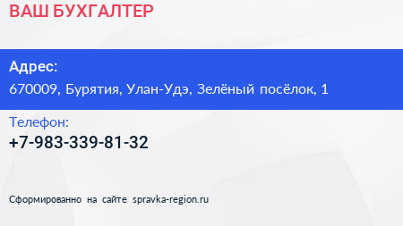ВАШ БУХГАЛТЕР по адресу 670009, Бурятия, Улан-Удэ, Зелёный посёлок, 1 в дальнейшем Организация, размещена в следующих категориях: