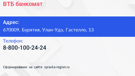 ВТБ, банкомат по адресу 670009, Бурятия, Улан-Удэ, Гастелло, 13 в дальнейшем Организация, размещена в следующих категориях: