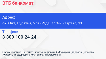 ВТБ, банкомат по адресу 670049, Бурятия, Улан-Удэ, 110-й квартал, 11 в дальнейшем Организация, размещена в следующих категориях: