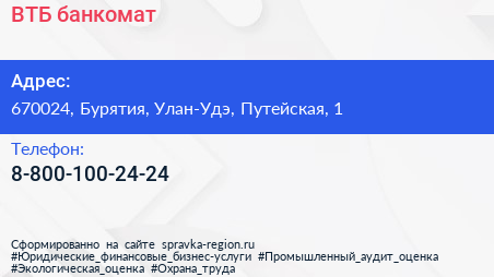 ВТБ, банкомат по адресу 670024, Бурятия, Улан-Удэ, Путейская, 1 в дальнейшем Организация, размещена в следующих категориях: