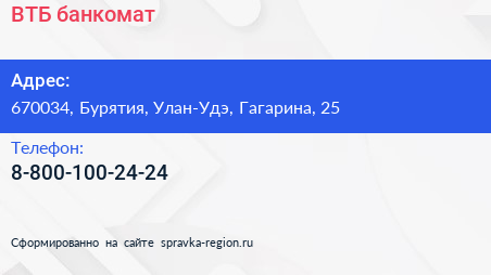 ВТБ, банкомат по адресу 670034, Бурятия, Улан-Удэ, Гагарина, 25 в дальнейшем Организация, размещена в следующих категориях: