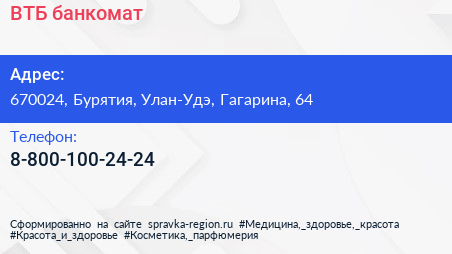 ВТБ, банкомат по адресу 670024, Бурятия, Улан-Удэ, Гагарина, 64 в дальнейшем Организация, размещена в следующих категориях: