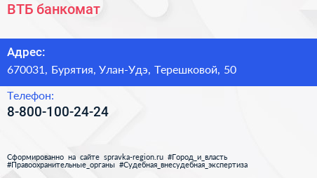 ВТБ, банкомат по адресу 670031, Бурятия, Улан-Удэ, Терешковой, 50 в дальнейшем Организация, размещена в следующих категориях: