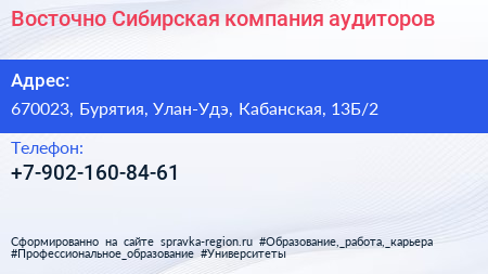 Восточно-Сибирская компания аудиторов по адресу 670023, Бурятия, Улан-Удэ, Кабанская, 13Б/2 в дальнейшем Организация, размещена в следующих категориях:
