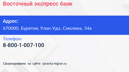 Восточный экспресс банк по адресу 670000, Бурятия, Улан-Удэ, Смолина, 54а в дальнейшем Организация, размещена в следующих категориях: